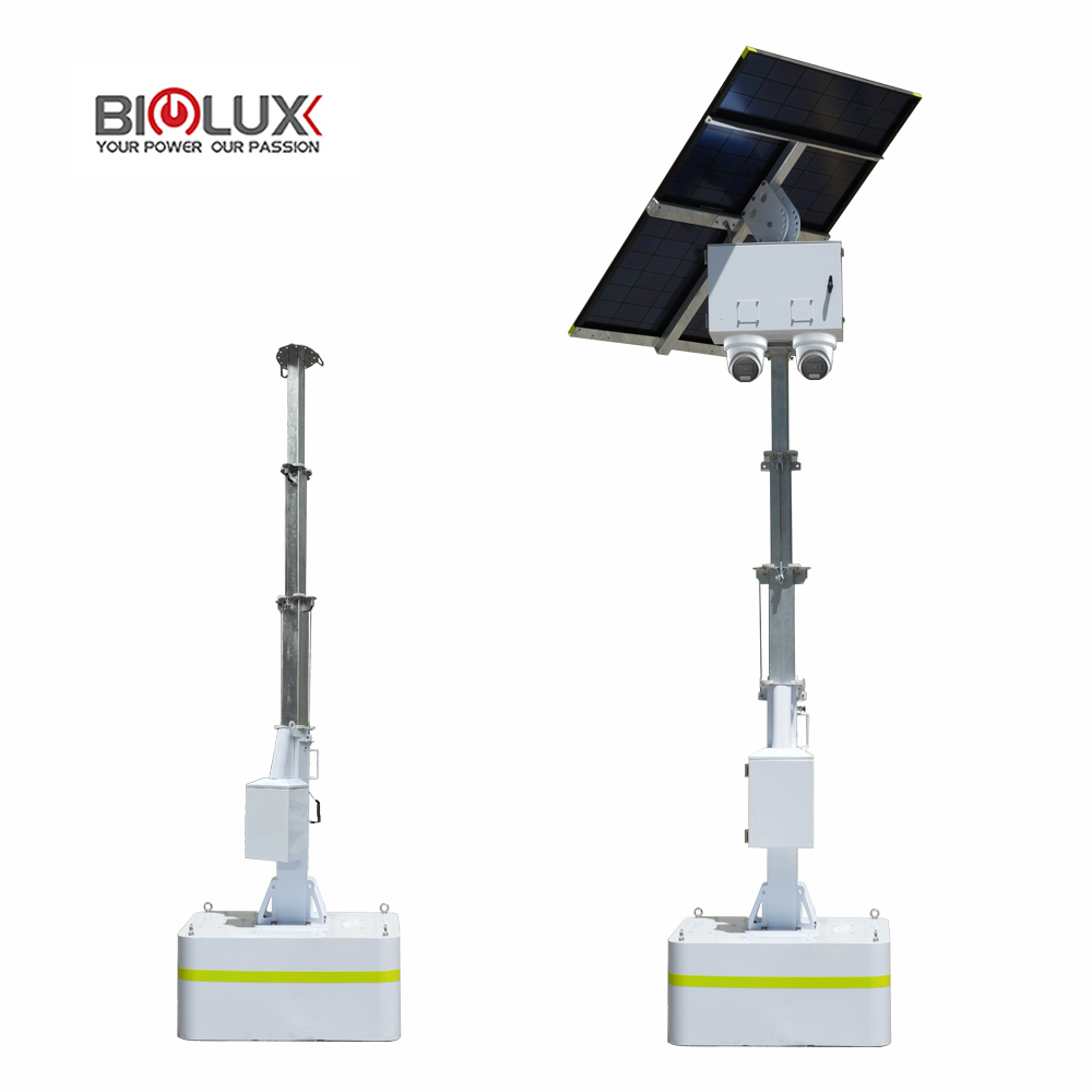 Biglux solar trailer can be use install with CCTV surveillance cameras for security ,back up generator and LED light installation available .usually it is used for construction site and any big events ,parking lot,mining area garden,etc, solar power trailer with 3pannel,each pannel with 435W, and 3Kw inverter ,that you will not worry about power shortage ,the inverter can be used DC power to AC ,you just use a plug board can supply power to mobile charge any others ,not only this ,but it is mainly supply power to CCTV surveillance device ,this trailer also have plug and socket ,taht you can not only supply power to others outside device by battery ,but alos can supply power from outside device to battery ,such as commercial power.